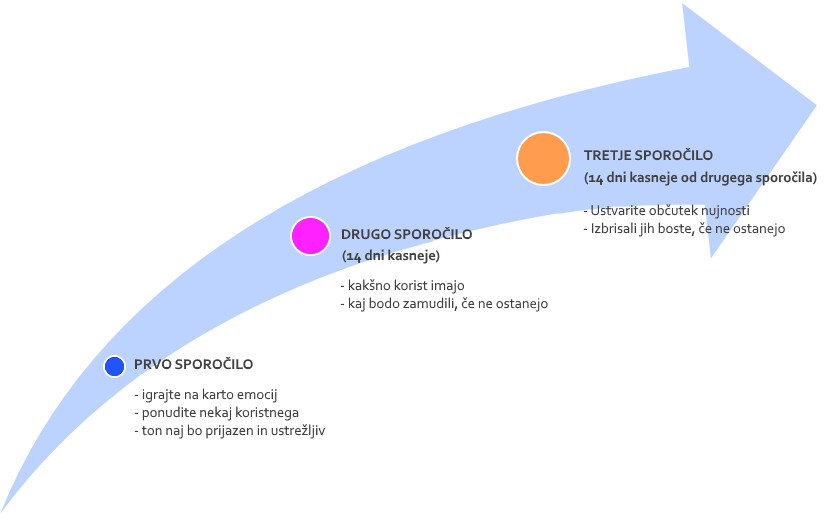 Najbolj optimalno je, da vaša celotna strategija vsebuje tri različna sporočila, ki jih pošiljajte na 14 dni.