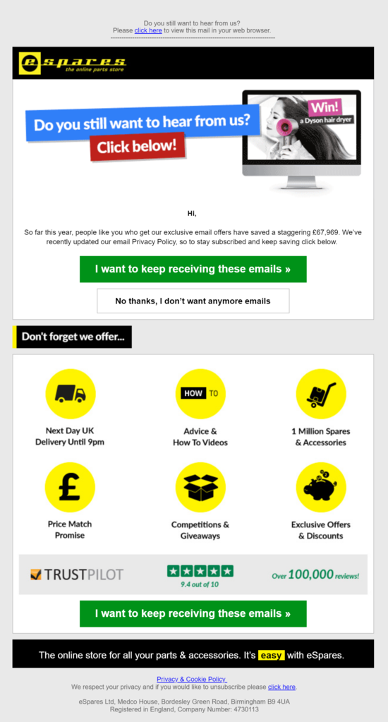 Podjetje Espares je dober primer, kako lahko poveste prejemnikom kakšno vrednost imajo, ker prejemajo vaša sporočila: »…ljudje, kot ste vi, ki prejemajo naše ekskluzivne email ponudbe, so prihranili že xx € v letošnjem letu…« in jim hkrati podate tudi prednosti za to.