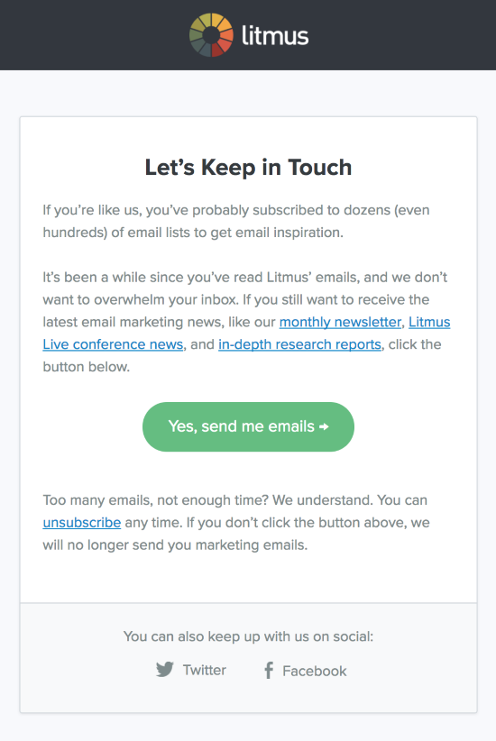 Podjetje Litmus sicer pošilja takšne kampanje za oživljanje neaktivnih prejemnikov, vendar se lahko na podoben način lotite tudi vi s sporočili za zbiranje soglasij. Vaše besedilo naj bo odkrito in direktno, na primer: