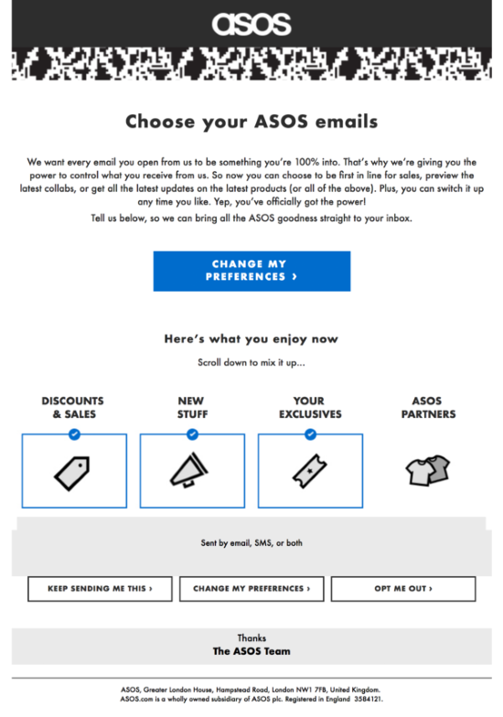 Naslednji primer je podjetje Asos, ki s svojim lepo oblikovanim sporočilom vsekakor zagotovi dobro uporabniško izkušnjo. Namesto, da takoj vprašajo za soglasje, najprej ponudijo prejemnikom na izbiro, kakšno vsebino si želijo prejemati.