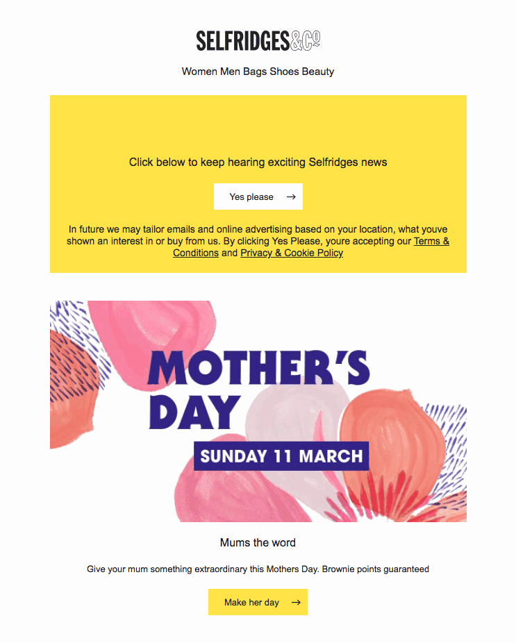 Živo rumena barva in animirana vsebina je kombinacija, ki vsekakor privablja pozornost. Pri podjetju Selfridges&Co so vsebino za pridobivanje soglasij dodali kar v promocijsko sporočilo. Sicer je sama vsebina sporočila potisnjena nižje in vso pozornost jemlje gumb za soglasje, vendar lahko za to, da obdržite prejemnike, tudi tvegate nekaj manj klikov na vašo spletno stran.