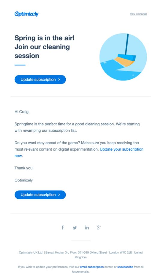 Tako kot sporočilo podjetja Asos, tudi pri Optimizely-u ne omenjajo GDPR zakona in na zabaven način povabijo na podajanje soglasja, kot »Spomladansko čiščenje!«