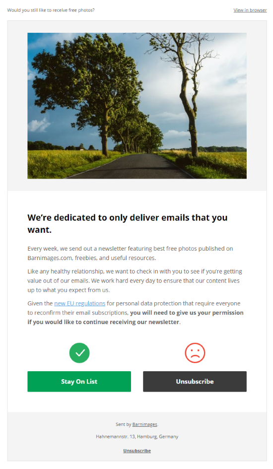 Pri podjetju Barnimages so po opisu, zakaj pošiljajo to sporočilo in kaj pričakujejo, dodali dva gumba: enega za pridobitev soglasja, drugega za odjavo. Tako so prejemnikom omogočili takojšnjo akcijo in na vizualen način tudi poskušali vplivati na njihovo odločitev.