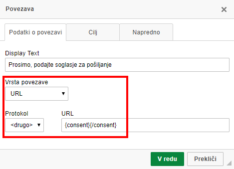 Ne pozabite dodati povezave {consent}{/consent} ali {autoconsent}{/autoconsent}, kjer podajo soglasje.