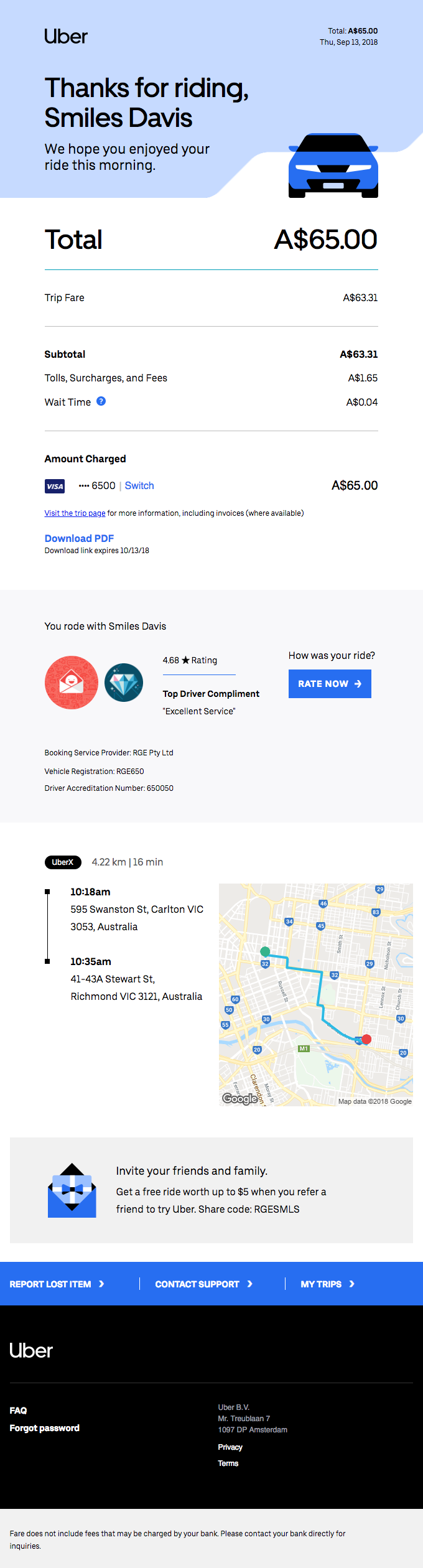 Dandanes je vse digitalno – tudi potrdila o plačilu. In če storitev naročite v virtualnem svetu, je edino smiselno, da tudi potrdilo o plačilu in račun prejmete tam. Uber to priložnost seveda izkoristi še za prošnjo za povratne informacije, obenem pa vključi še možnost, da povabite prijatelja in pridobite popust.