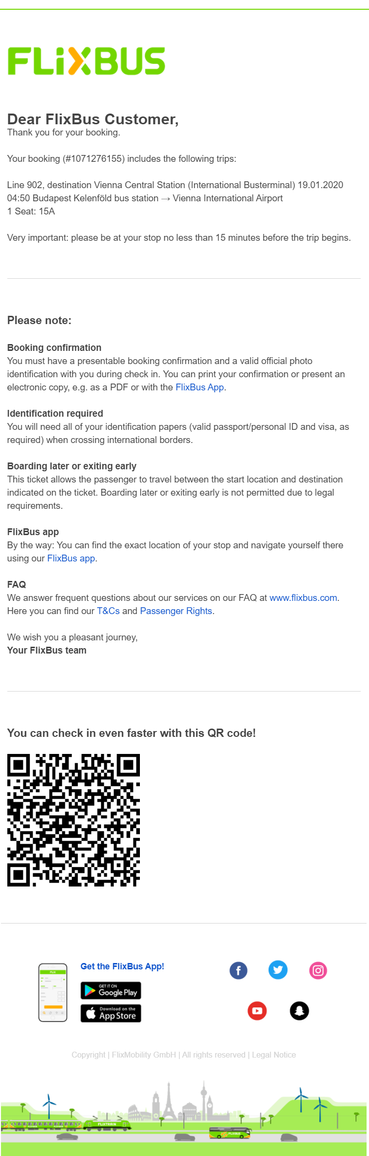 Potrditev rezervacije, ki jo strankam pošlje FlixBus, vsebuje popolnoma vse informacije, ki jih stranka potrebuje, zbrane v enem samem e-mailu – to strankam prihrani precej časa, ki bi ga sicer porabile za brskanje po več sporočilih in po spletni strani ponudnika. Obenem prejemnike spodbuja k prenosu aplikacije, ki omogoča še lažjo uporabo storitve, vključuje tudi ikone za družabna omrežja, ponuja pa tudi QR kodo, ki potnikom omogoča lažjo prijavo na vožnjo.