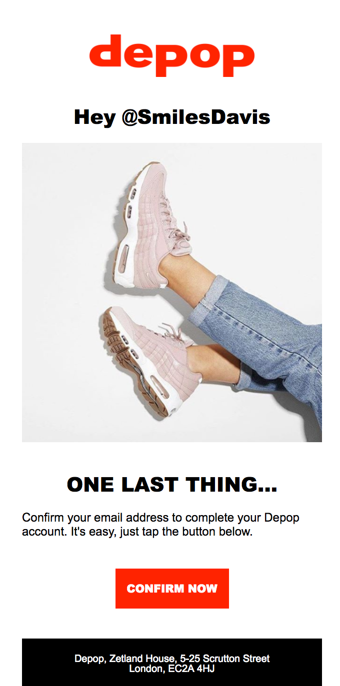 Vse več znamk od nas zahteva, da potrdimo svojo registracijo s klikom na povezavo v e-poštnem sporočilu. Razumljivo, tako se namreč izognejo napačno vpisanim e-mail naslovom, obenem pa si zagotovijo, da se registrirajo res le tisti, ki si to želijo. Znamka Depop se je odločila za pristop v slogu »manj je več« – preprosto sporočilo, ki doseže svoj cilj.