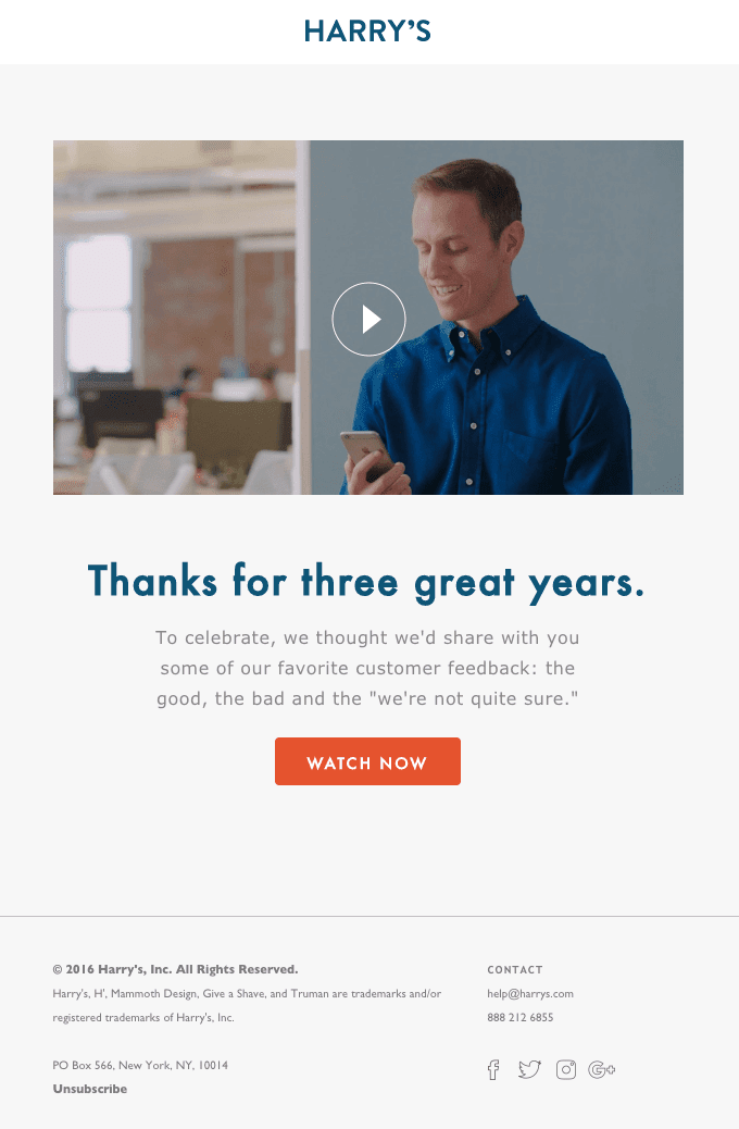 In točno to je storila znamka Harry’s. V svojem zahvalnem sporočilu so se najprej zahvalili svojim zvestim strankam, nato pa so se jih odločili razveseliti s kompilacijo povratnih informacij, ki so jih dobili s strani svojih strank. Nekatere so dobre, nekatere slabe, nekatere pa … hm, še sami niso prepričani.