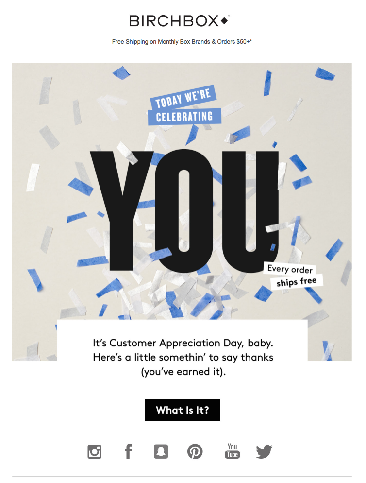 Znamka BirchBox Man ta dan praznuje z zabavnim, simpatičnim sporočilom, prijetno grafiko in – morda najpomembneje – odlično ponudbo: brezplačno poštnino in drugimi posebnimi ponudbami. Tako so z eno samo potezo pokazali, kako cenijo svoje stranke, in ustvarili odlično prodajno priložnost, ki jim je zagotovo prinesla odlične rezultate.