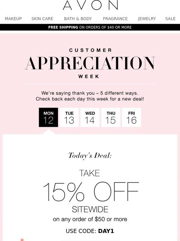 Pri prejšnji točki smo si ogledali odličen primer tega, da si znamke izmislijo poseben dan v zahvalo svojim strankam, znamka Avon pa je šla še korak dlje in je uvedla kar cel teden, v katerem slavi svoje zveste stranke. Vsak dan prinaša nove posebne ponudbe in nove priložnosti za ugodne nakupe.