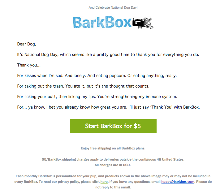 Svoje delo so odlično opravili pri znamki BarkBox, ki se ukvarja z izdelki za pse. Svojim strankam so sporočilo v zahvalo poslali ravno na svetovni dan psov in tako takoj navezali stik s prejemniki, ki obožujejo pse. Simpatično sporočilo, ki nagovarja štiritace ljubljenčke, pa poskrbi za prijeten vtis in veliko dobre volje pri prejemnikih.