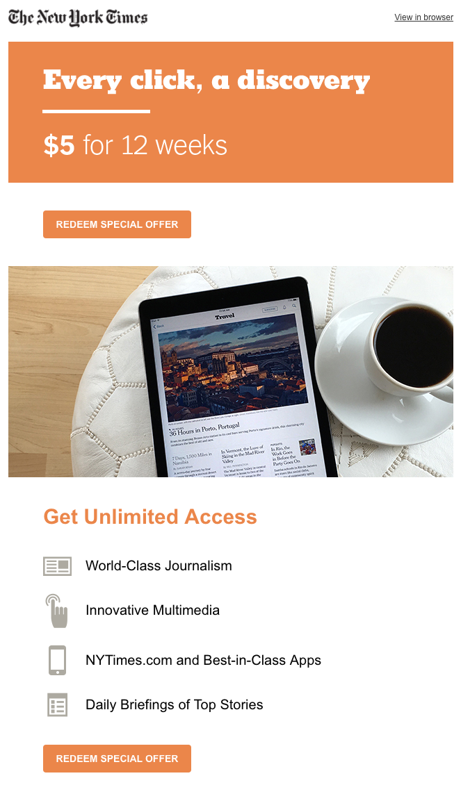 Če pripravljate posebno prodajno ponudbo, ni treba, da jo predstavite kot razprodajo ali prodajno akcijo – precej bolj učinkovito bo namreč, če jo strankam ponudite kot darilo v zahvalo za njihovo zvestobo. In The New York Times je storil prav to.