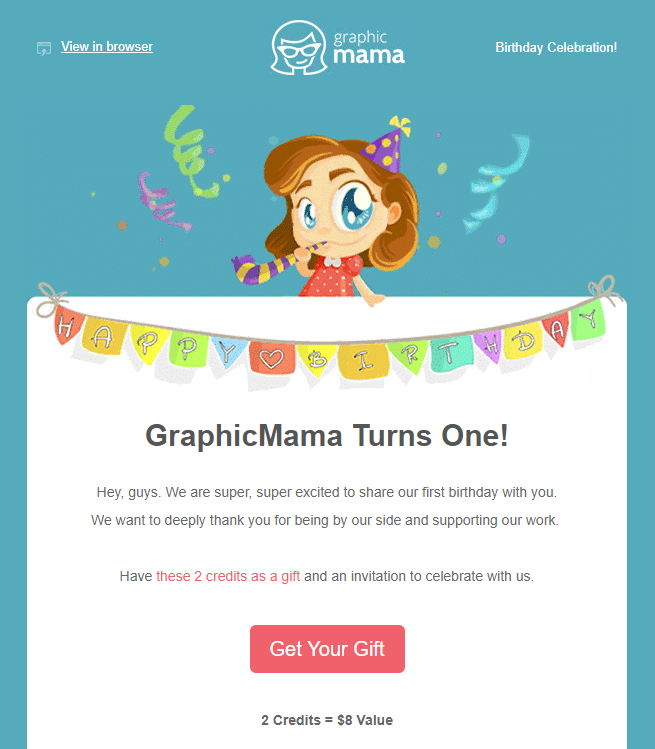 Tudi znamka GraphicMama svoje stranke rada razvaja in jim podarja posebna darila v znak svoje hvaležnosti. Ko je znamka tako praznovala svoj prvi rojstni dan, so svojim strankam z veseljem podelili posebne kredite, ki jih lahko prejemniki izkoristijo za njihove storitve.