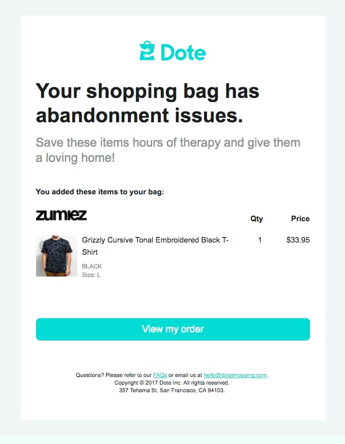 E-pošta ob zapuščeni košarici je poslana takrat, ko uporabnik v spletni trgovini v košarico zloži izdelke, nato pa jih ne kupi. Za to seveda obstajajo številni razlogi, a dejstvo je, da so prav zapuščene košarice odgovorne za največji izpad v prodajnem lijaku. Zato je zelo pomembno, da te stranke nekako nagovorimo in opomnimo, da naj nakup izpeljejo do konca.
