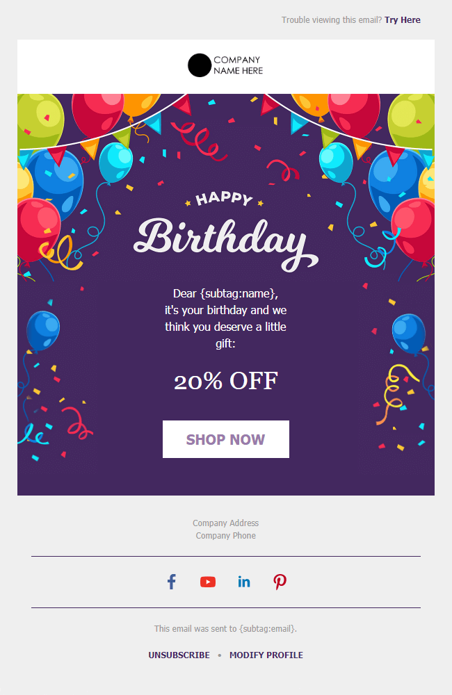 Svojim strankam lahko ob pomembnih datumih, denimo ob njihovem rojstnem dnevu ali pa ob obletnici datuma, ko so se registrirali na vaši spletni strani, pošljete e-pošto s posebno ponudbo, s kakšnim popustom ali preprosto s čestitko in zahvalo, da ostajajo v vaši družbi.