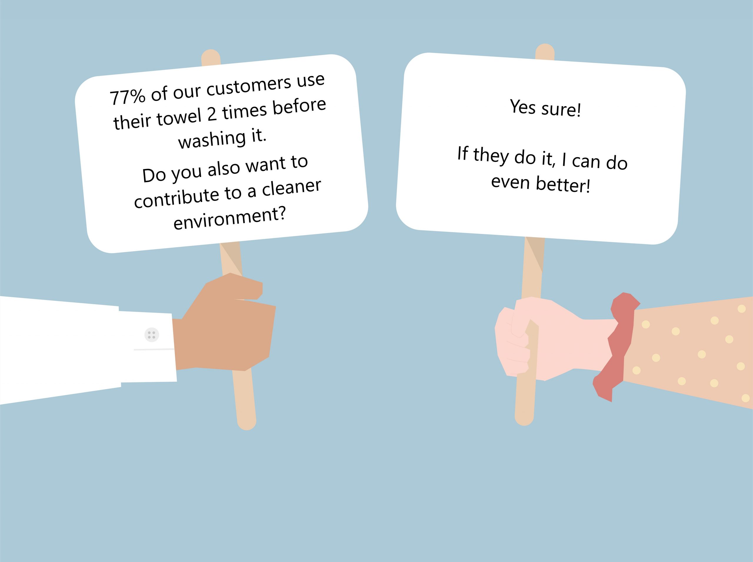 In res ga. Gosti, ki so bili obveščeni, da je kar 75 % gostov, ki so v hotelu bivali pred njimi, ponovno uporabilo svoje brisače, so se odzvali še mnogo bolje, saj se je ponovna uporaba brisač povišala še za dodatnih 33 %.