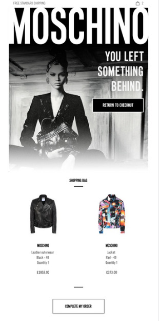 Pri znamki Moschino so se tako odločili, da bodo stranke, ki nakupa niso izpeljale do konca, na to spomnili. Poslali so jim e-poštno sporočilo, v katerem razkrivajo, kaj je ostalo v košarici, in jih spodbujajo, da nakup zaključijo.
