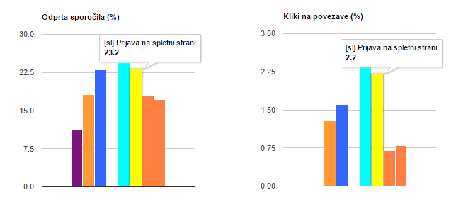 Spremljajte rezultate vaših email marketing kampanj – kdo je prejel in odprl newsletter, kliknil na povezavo ali se odjavil. Zelo dober kazalnik rezultatov je tudi uspešnost vsebine, ki je zračunana kot razmerje med odprtimi sporočili in kliki na povezave. Avtomatsko se beleži tudi statistika odbojev in spodletelih sporočil.