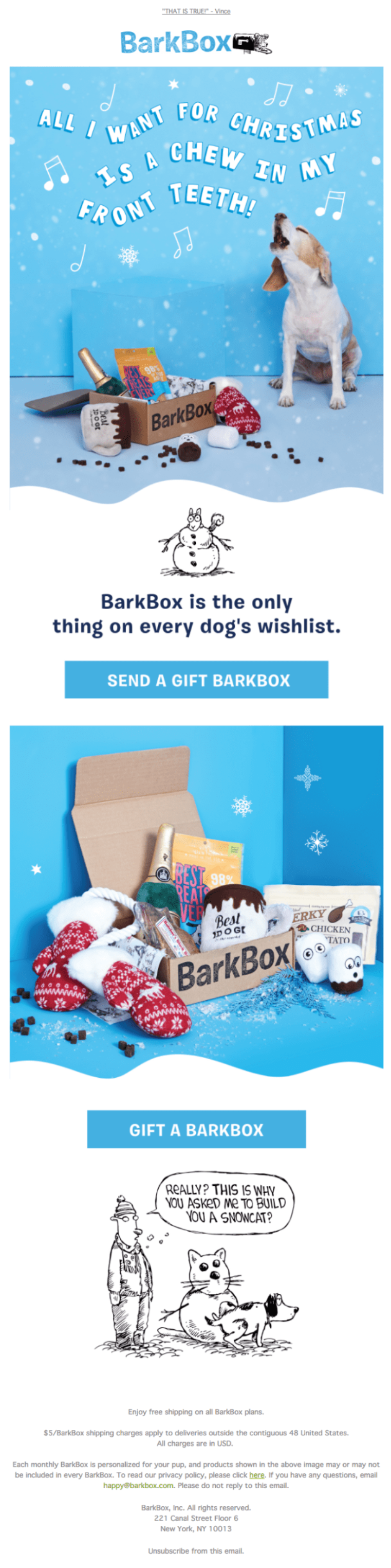 Božič je čas veselja in dobre volje, zato je pomembno, da to izžarevajo tudi vaša sporočila. Tega se dobro zavedajo pri znamki BarkBox, zato so pripravili zabavno sporočilo, polno humorja in besednih iger, ki je zagotovo razveselilo vse njihove prejemnike. Ker so tako uspešno navezali stik s strankami, so dosegli tudi odlične prodajne rezultate.