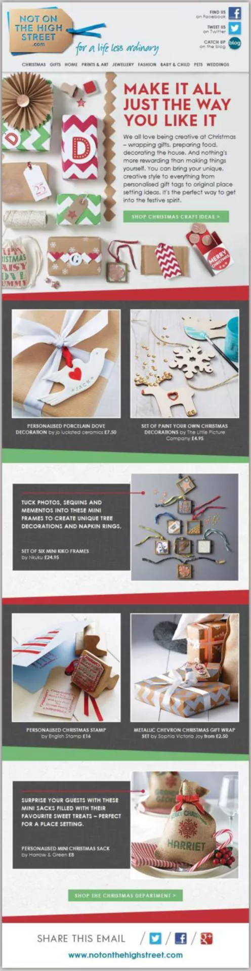 V prazničnem času so vsa e-poštna sporočila precej podobna – vsi pač pošiljajo posebne ponudbe. Če boste v tem času za svoje stranke pripravili kaj drugega, boste s tem dosegli odlične rezultate. Znamka Not On The High Street je za svoje prejemnike tako pripravila zelo zanimive vsebine, v katerih razkriva, kako ustvariti domače dekoracije. S tem so na inovativen in kreativen način svoje stranke opomnili nase, obenem pa niso bili vsiljivo prodajni.