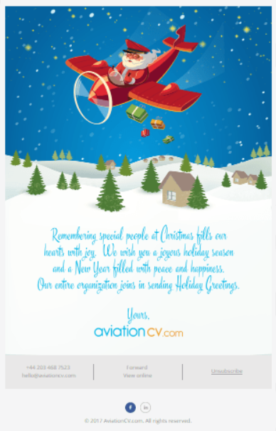 Pogosto pravimo, da je manj v resnici več – in to še kako drži v svetu e-poštnega marketinga. V času, ko bodo vse ostale znamke pošiljale posebne ponudbe, pripravljale nore razprodaje in skušale svoje stranke na vsak način prepričati v nakup, lahko prav vi izstopate s tem, da svojim prejemnikom preprosto zaželite lepe praznike. To so denimo storili pri znamki AviationCV in s tem vzpostavili topel odnos s svojimi strankami, kar je zagotovo odličen temelj za prihodnost.