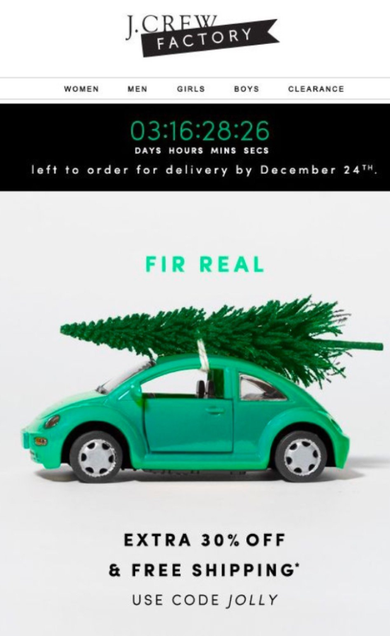 Odštevalniki so odlično orodje za uporabo v e-poštnih sporočilih, saj pomagajo ustvariti občutek nujnosti in stranke prepričajo, da čim hitreje opravijo svoj nakup. Znamka J.Crew jih je v tem primeru združila še z visokim popustom in za piko na i še brezplačno dostavo, kar je kombinacija, ki je zagotovo premamila številne stranke.