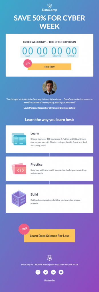 Večkrat smo že omenili, da ustvarjanje občutka nujnosti in časovnega pritiska prejemnike učinkovito spodbudi k nakupu, zato si oglejmo še primer takega newsletterja. Podjetje Data Camp, ki ponuja spletna izobraževanja, je v zadnjem Cyber tednu tako ponudilo visok popust, obenem pa je z odštevalnikom jasno omejilo čas popusta.