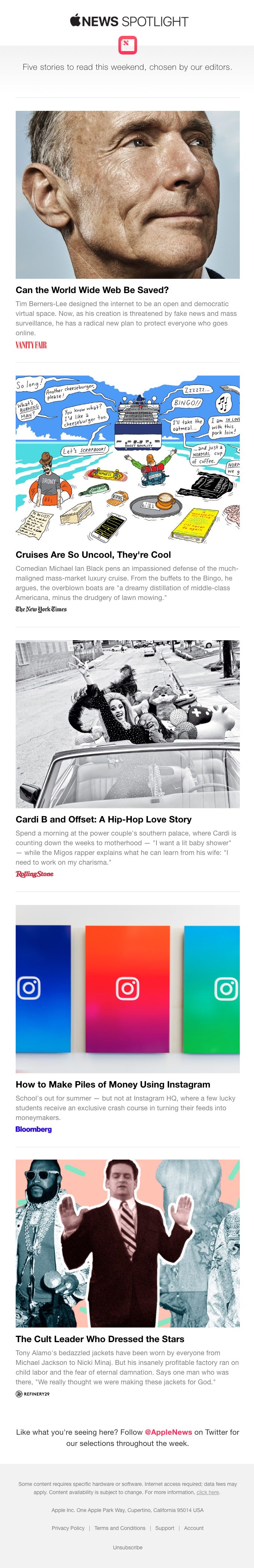 Če v svojih newsletterjih prejemnikom posredujete novice, bloge in ostalo vsebino, je newsletter Apple News zagotovo eden od najboljših zgledov, ki bi jim morali slediti. Preprosto, urejeno, a vseeno privlačno in učinkovito!