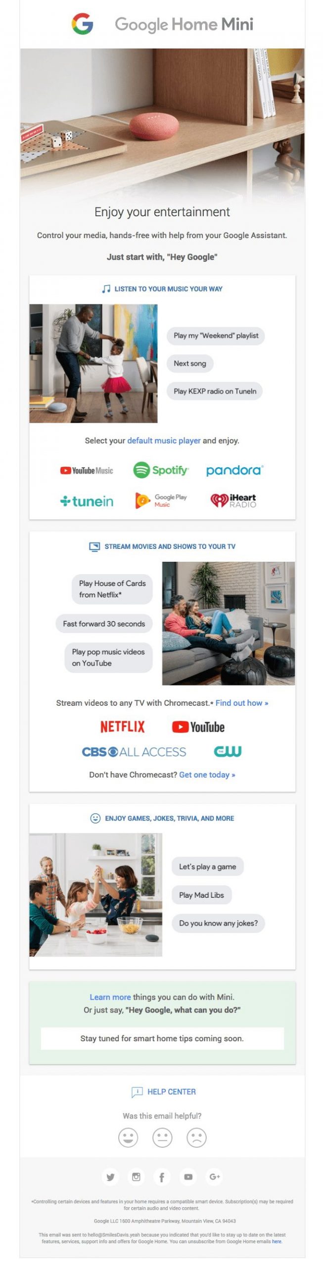 Če v svojih newsletterjih običajno obdelate veliko različnih tem in zajamete veliko različnih vsebin, je vse skupaj lahko videti precej kaotično in neurejeno, kar običajno ne pritegne prav veliko bralcev. Google Home Mini ponuja odličen zgled, kako lahko tudi številne različne teme s pravim dizajnom prikažete na urejen način.