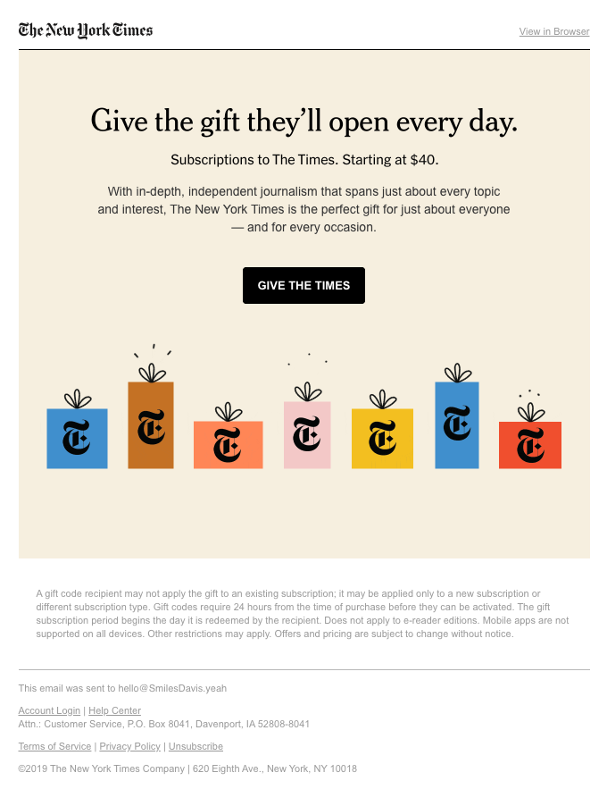 Manj je več – dobro znano pravilo dizajna velja tudi v email marketingu. Številne znamke zato sledijo enostavnim dizajnom z veliko praznega prostora, ki ustvari občutek zračnosti, olajša berljivost besedila in prejemnikov ne obremeni s preveliko količino informacij. Med njimi tudi znameniti New York Times.