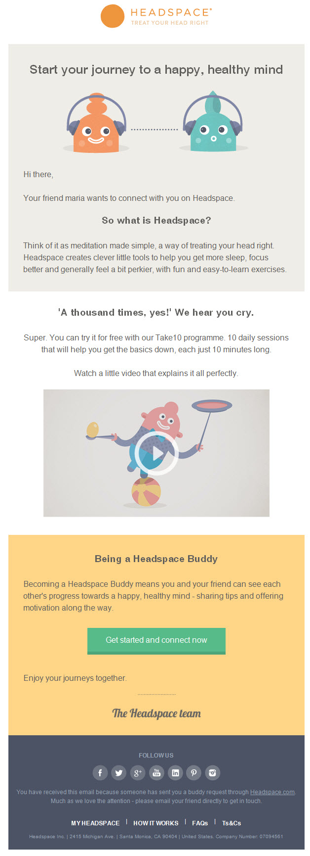 Headspace je poleg tega tudi odličen primer uporabe video vsebin v newsletterju. E-poštno sporočilo, ki si ga ogledujemo, je namenjeno novim uporabnikom, ki aplikacije še ne poznajo, zato jim ponuja kratko predstavitev v video obliki, ki na jedrnat in prijazen način razloži vse funkcije in prednosti aplikacije.