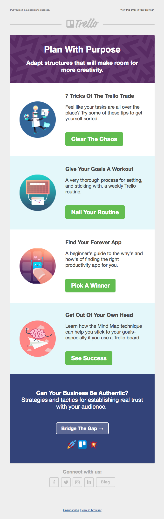 Za piko na i je podjetje Trello vse skupaj podkrepilo še z zabavnimi ilustracijami in jasnimi, privlačnimi pozivi k dejanju na zeleni podlagi. Vse skupaj je tako barvno usklajeno, ravno prav živahno in nadvse privlačno za prejemnike, ki bodo skoraj zagotovo kliknili na katero od zanimivih povezav.
