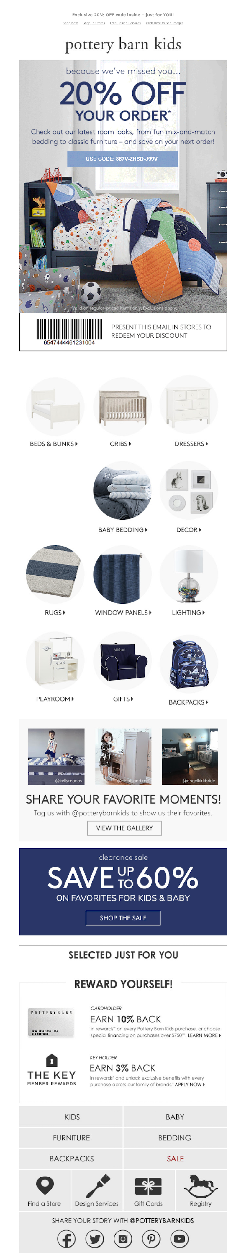 Eden od najpomembnejših trendov email marketinga za leto 2020 so tako tudi uporabniško ustvarjene vsebine, Pottery Barn Kids pa ponuja odličen zgled, kako uporabiti to orodje. V svoj newsletter so namreč vključili fotografije uporabnikov, na katerih otroci uporabljajo njihove izdelke. Privlačno, prepričljivo in obenem še kako prisrčno.