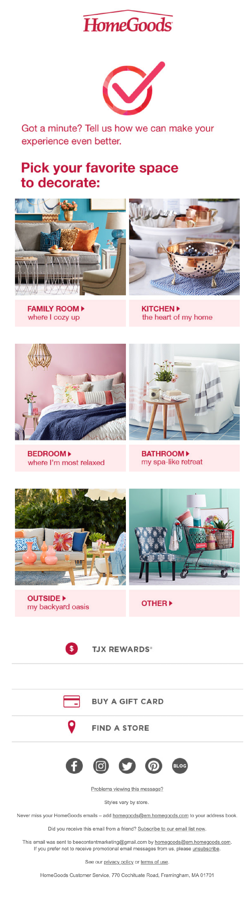 Tudi newsletter HomeGoods je izjemno učinkovit pri pridobivanju povratnih informacij svojih prejemnikov. Na nevsiljiv in časovno nezamuden način jih poprosi, da jim zaupajo svoje želje in interese, pri tem pa pridobita obe strani: prejemniki, ki dobivajo več vsebin, ki jih dejansko zanimajo, in pošiljatelj newsletterja, ki ima sedaj več uporabnih informacij o svojih strankah.