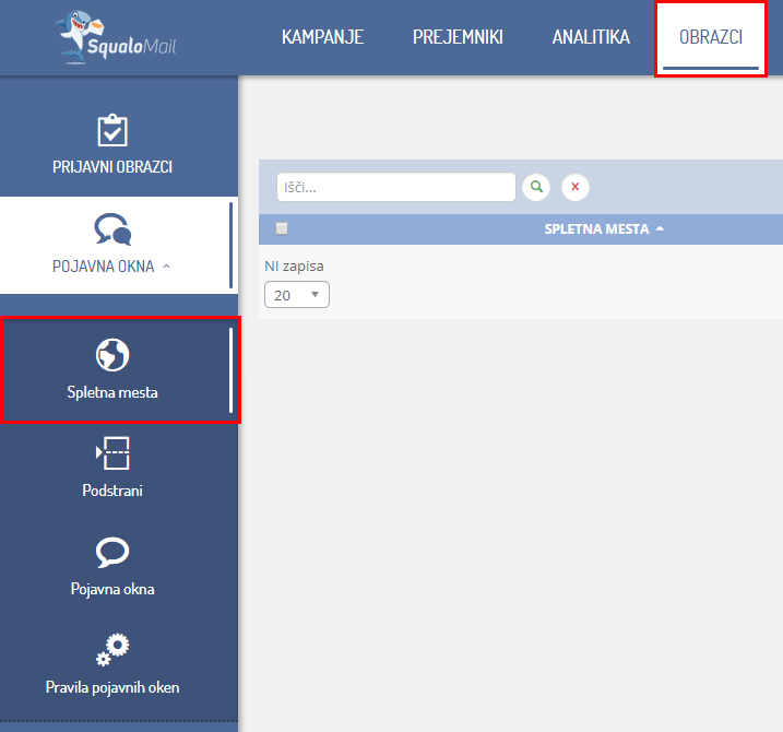 1. V glavnem meniju zgoraj izberite Obrazci > POJAVNA OKNA > Spletna mesta.
