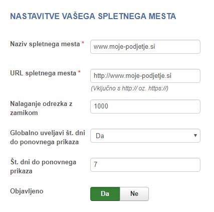 Primer: www.moje-podjetje.si - URL spletnega mesta – Tukaj vpišite celoten URL naslov vaše spletne strani, vključno s http:// oz. https:// in www oziroma brez www.