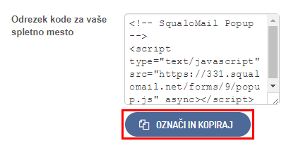 5. Pojavilo se vam bo novo polje Odrezek kode za vaše spletno mesto. Tukaj kliknite na gumb Označi in kopiraj.