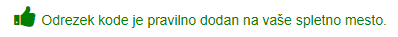 - Če ste pravilno vnesli odrezek kode na vašo spletno stran, se mora pojaviti zelena kljukica. V kolikor temu ni tako, ponovno preverite v HTML kodi vaše spletne strani, ali je le-ta vnesena pravilno.