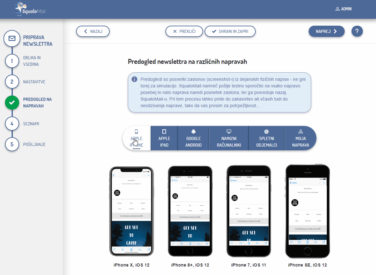 Tretji korak Čarovnika, vam omogoča Predogled newsletterja na različnih napravah (Apple iPhone, Apple iPad, Google Android, namizni računalniki…) in najbolj pogostih spletnih odjemalcih (Gmail, Office 365, Outlook…).