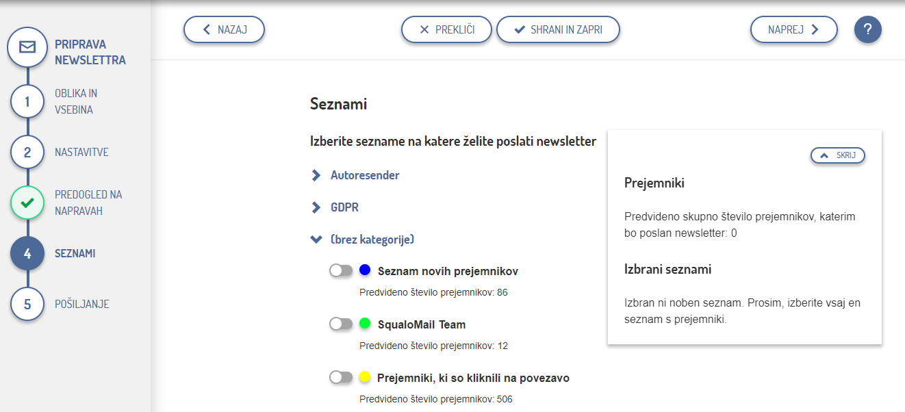 V četrtem koraku Čarovnika določite SEZNAME prejemnikov, na katere želite poslati vaš newsletter.
