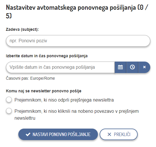 Ko ste newsletter poslali, lahko s klikom na gumb NASTAVI AVTOMATSKO PONOVNO POŠILJANJE newsletter ponovno pošljete vsem prejemnikom, ki ga niso odprli oziroma niso kliknili na povezavo (navodila).
