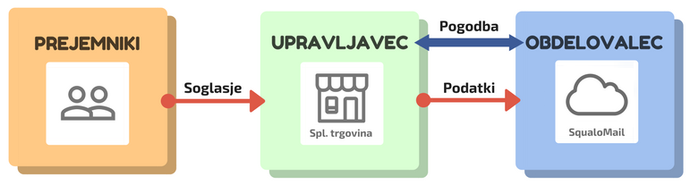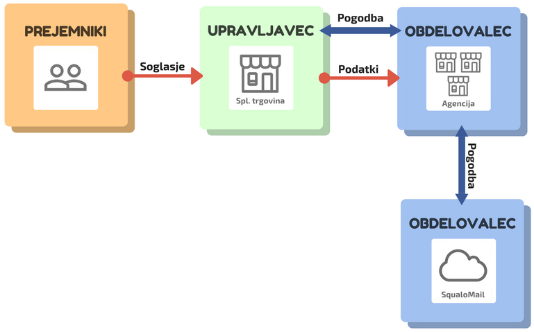 - Lastnik spletne trgovine preda Prejemnikove podatke podjetju, ki ponuja platformo za email marketing — na primer Squalo — in s katerim že ima sklenjeno pogodbo o obdelavi podatkov. To podjetje tako postane Obdelovalec.