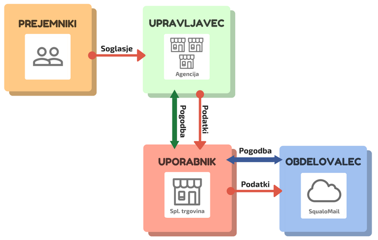 - Oglaševalec najame podjetje, ki ponuja platformo za email marketing — na primer Squalo — s katerim sklene pogodbo o obdelavi osebnih podatkov. To podjetje tako postane Obdelovalec.