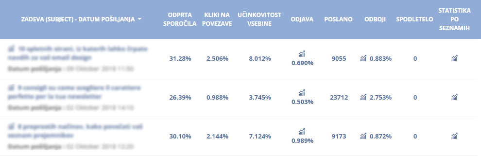Nato sledite petim korakom Čarovnika za pripravo newsletterja, kjer določite nastavitve in izberete sezname na katere želite newsletter poslati ter nastavite dan in uro pošiljanja. Prejemniki nato prejmejo newsletter v svoj poštni predal, vi pa lahko pregledujete v Statistiki newsletterjev, kdo je sporočilo odprl, kliknil na povezavo oziroma se odjavil od prejemanja.