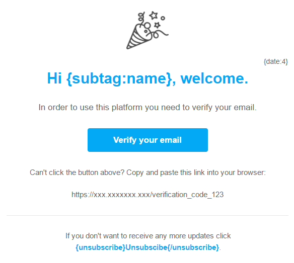 V Zadevo lahko vstavite na primer oznako za prejemnikovo ime {subtag:name}, v telo sporočila datum {date:4}, v tekstovni element v nogo newsletterja pa povezavo za odjavo {unsubscribe}{/unsubscribe}.