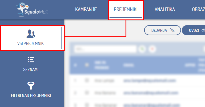 Prejemniki so vaša adrema oziroma baza email naslovov, na katere pošiljate sporočila. En prejemnik je en email naslov.