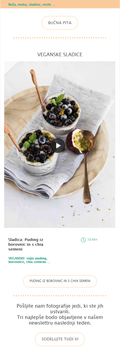 Najprej jim je predstavil video napotke za nove recepte, tokrat za sladice. V tem sporočilu pa je potem prejemnike prosil, da mu pošljejo fotografije jedi, ki so jih pripravili po njihovih receptih. Trije najboljši bodo objavljeni v newslettru naslednjega tedna, zmagovalcu pa bodo poslali še majhno darilo.