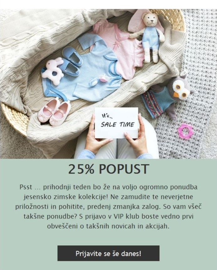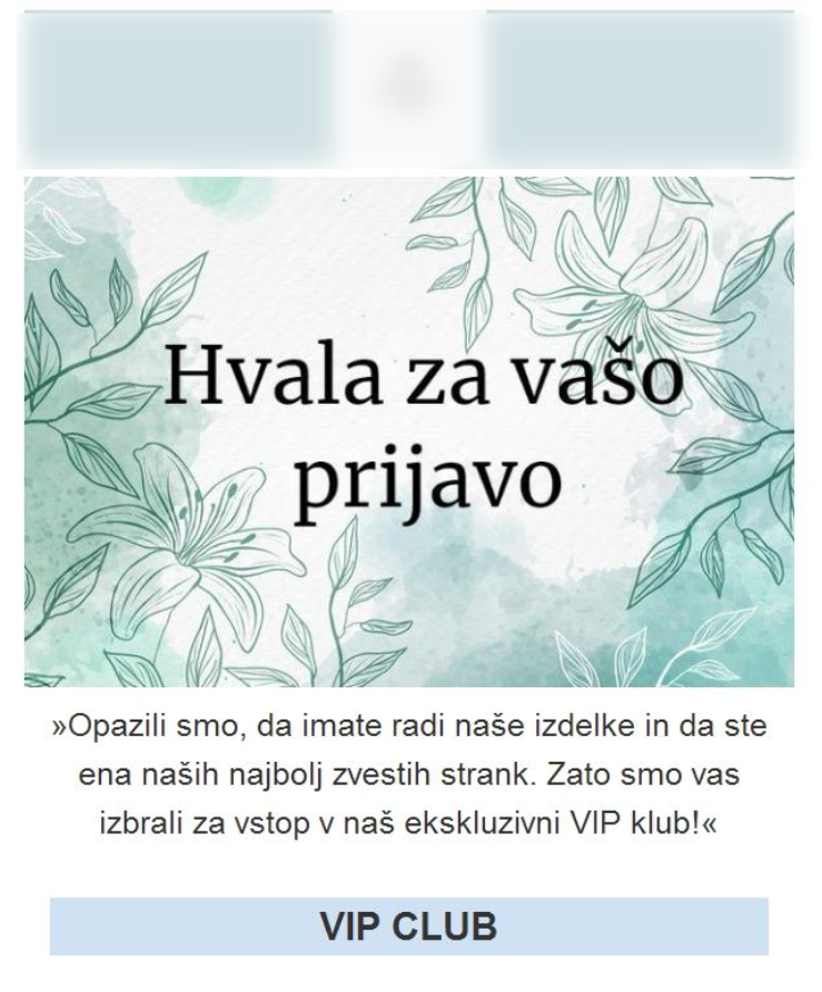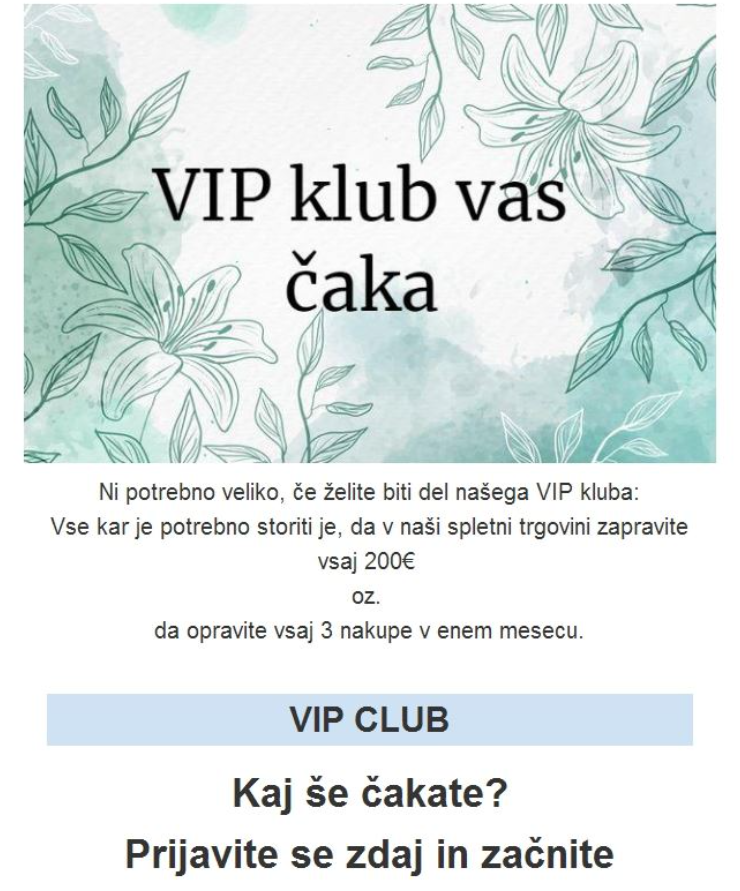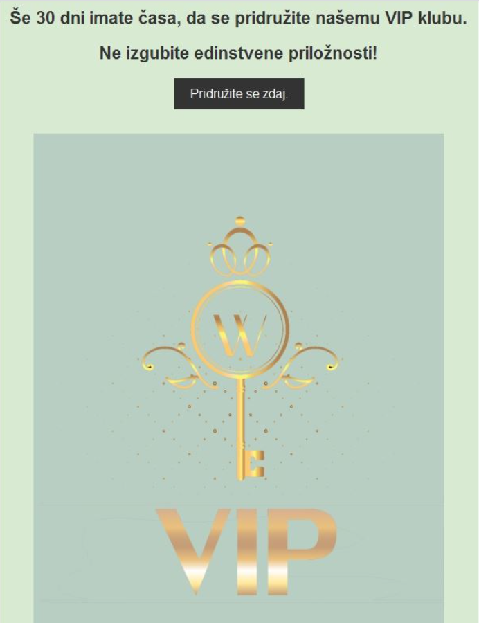 Prvo e-poštno sporočilo vsebuje vabilo za članstvo v VIP Klubu.