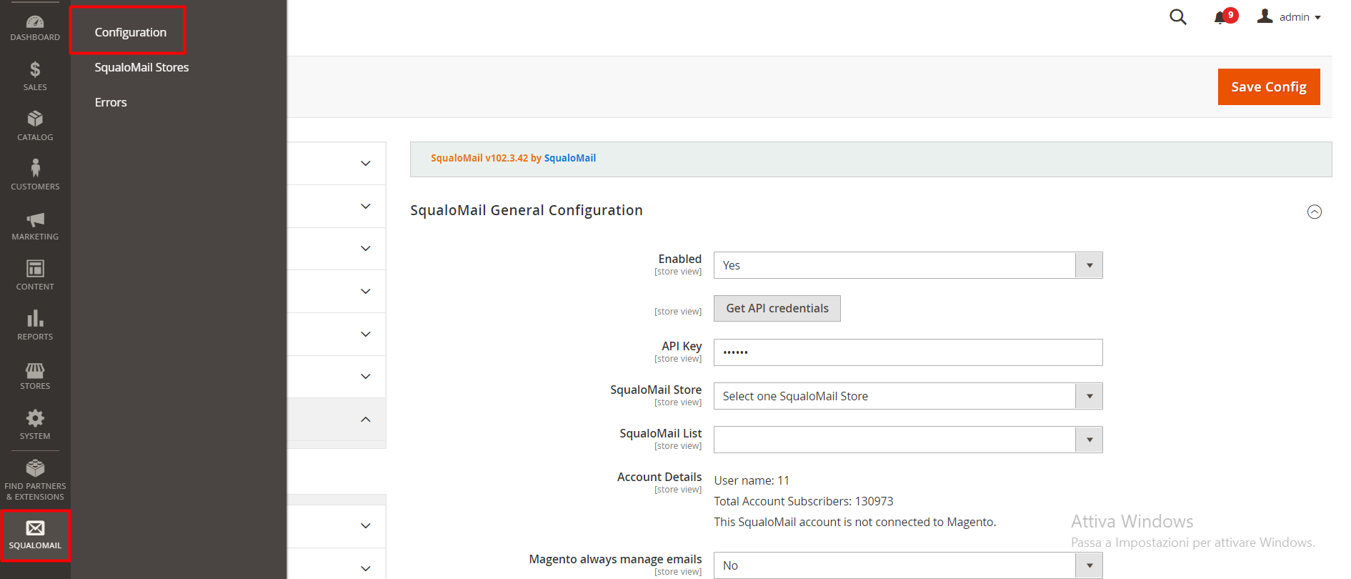 - Ko je trgovina ustvarjena, kliknite Squalo -> Configuration in izberite ustvarjeno trgovino, seznam, vse druge zahtevane informacije, omogočite e-ecommerce, omogočite abandoned cart in kliknite Save