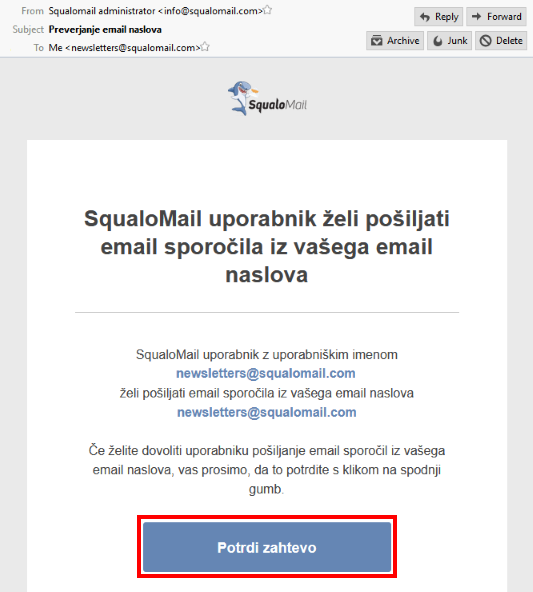 Ob registraciji ste na email naslov prejeli sporočilo z naslovom »Preverjanje email naslova«. V sporočilu kliknite na gumb Potrdi zahtevo, da potrdite, da ste vi lastnik email naslova iz katerega želite pošiljati.